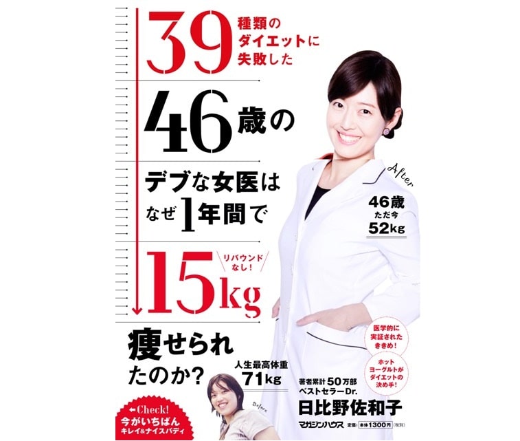 こんな私ですが、42歳の時ついに1年間で15キロのダイエットに成功。健康的にやせたことで肌年齢は22歳、しかもいまだにリバウンドなしです!」(日比野先生)。