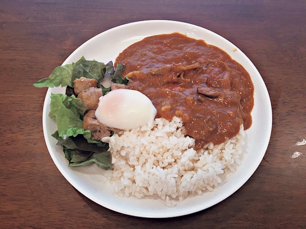 【13:00昼食】カレーパウダーベースにスパイスをたっぷり混ぜたカレー。温泉卵で栄養素をプラス。