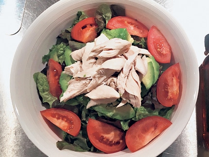 【19:00夕食】水耕栽培の「アメ玉レタス」を使ったサラダ。ゆで鶏肉も入れてたんぱく質も摂取。