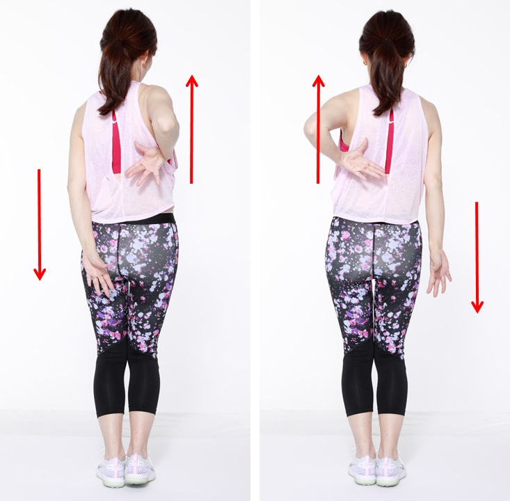 1:まずは、右手を内側に寄せるようにあげましょう。左腕も同様に上げて、右手は少し下げるような気持ちで。鎖骨付近から脇の下、肩甲骨付近にある「褐色脂肪細胞」を動かすことで、やせやすい身体に。