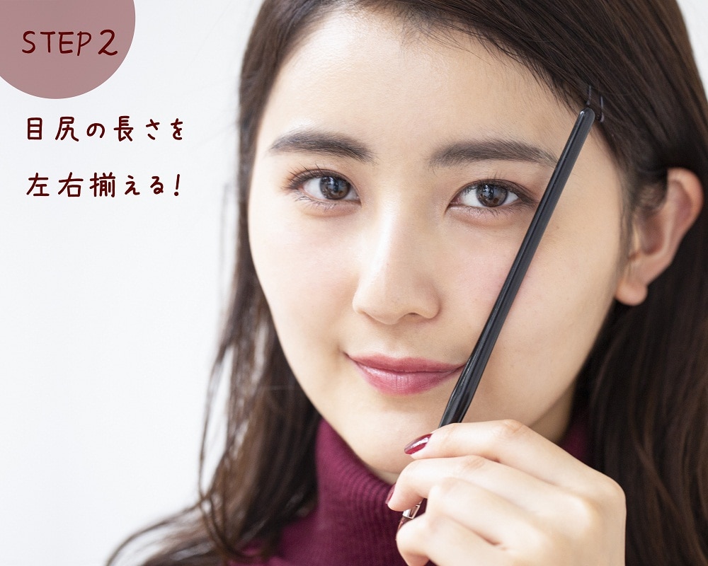 眉尻の目安は口角と目尻を直線で繋いだ延長線上。ペンシルやブラシの柄を当てながらチェックすると「左右の眉の長さが違う!」という事態を防げます。