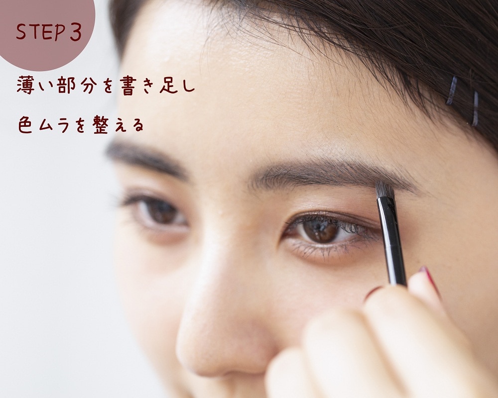 眉尻のポイントが決まったら、ステップの1の眉山部分とつなげます。このとき、こめかみの生え際の角度と眉尻のカーブが並行になるようにすると、立体的な美バランスに! 眉がつながったら、毛が薄い部分をパウダーで埋めましょう。濃いめの色をブラシにとり、ポンポンとスタンプを押すように塗ると、よりムラがなくなりますよ。さらに、顔から鏡を離してチェックすると、色ムラを見つけやすいので試してみて。
