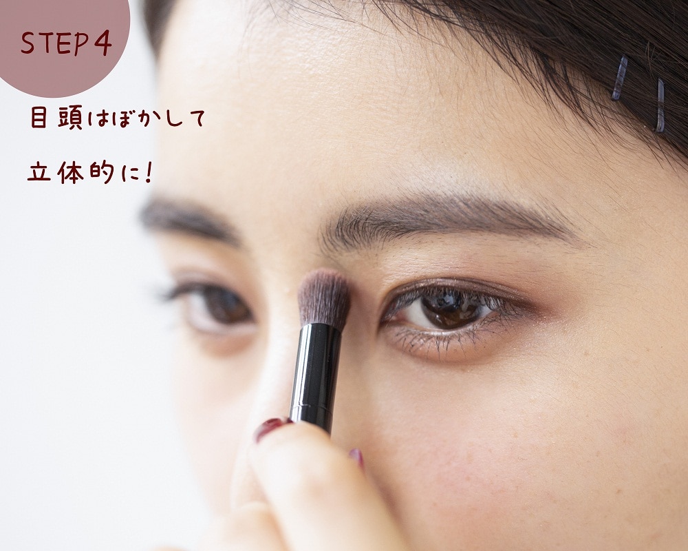 眉頭は、一番太いブラシを使い、パレット右の淡い色を眉の中央部分からぼかし伸ばすように描くと、自然なグラデーションに。そのままノーズシャドウまでつなげて、鼻筋をすっきり立体フェイスに。