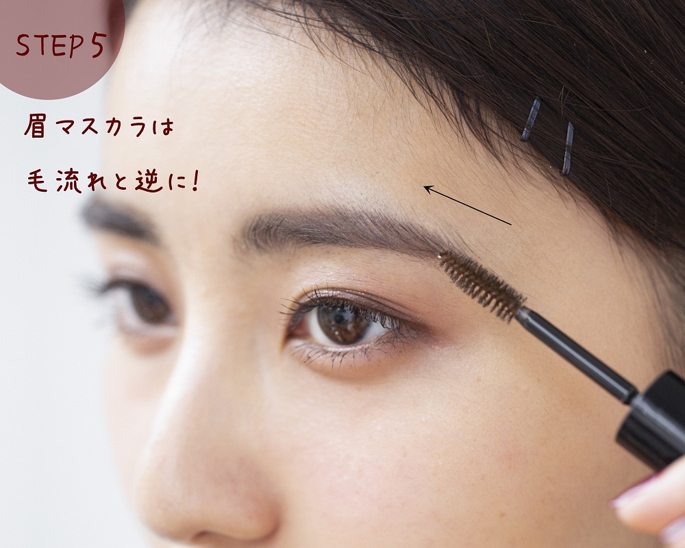 仕上げに眉マスカラをオン。塗る前にティッシュオフして、余分なマスカラを拭うのを忘れずに。あえて毛の流れの逆らって塗ることで、寝ている眉毛を起こし、マスカラを地肌に付けずに、毛の部分だけ根元からキレイに塗れます。