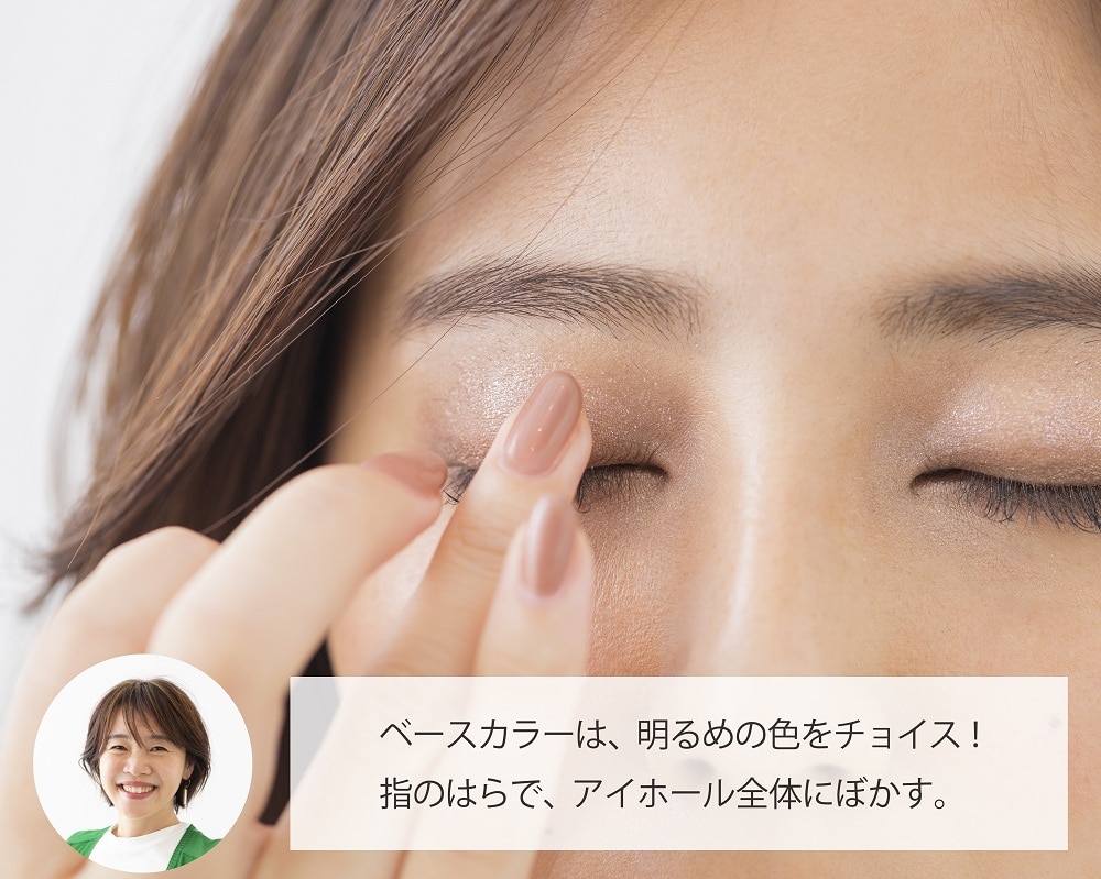 ベースカラーには明るめのアイシャドウを選択。くすみをはらい、レフ板効果で瞳までクリアに見せてくれます。塗り方は、指の腹にアイシャドウをとり、アイホール全体にぼかすようになじませましょう。