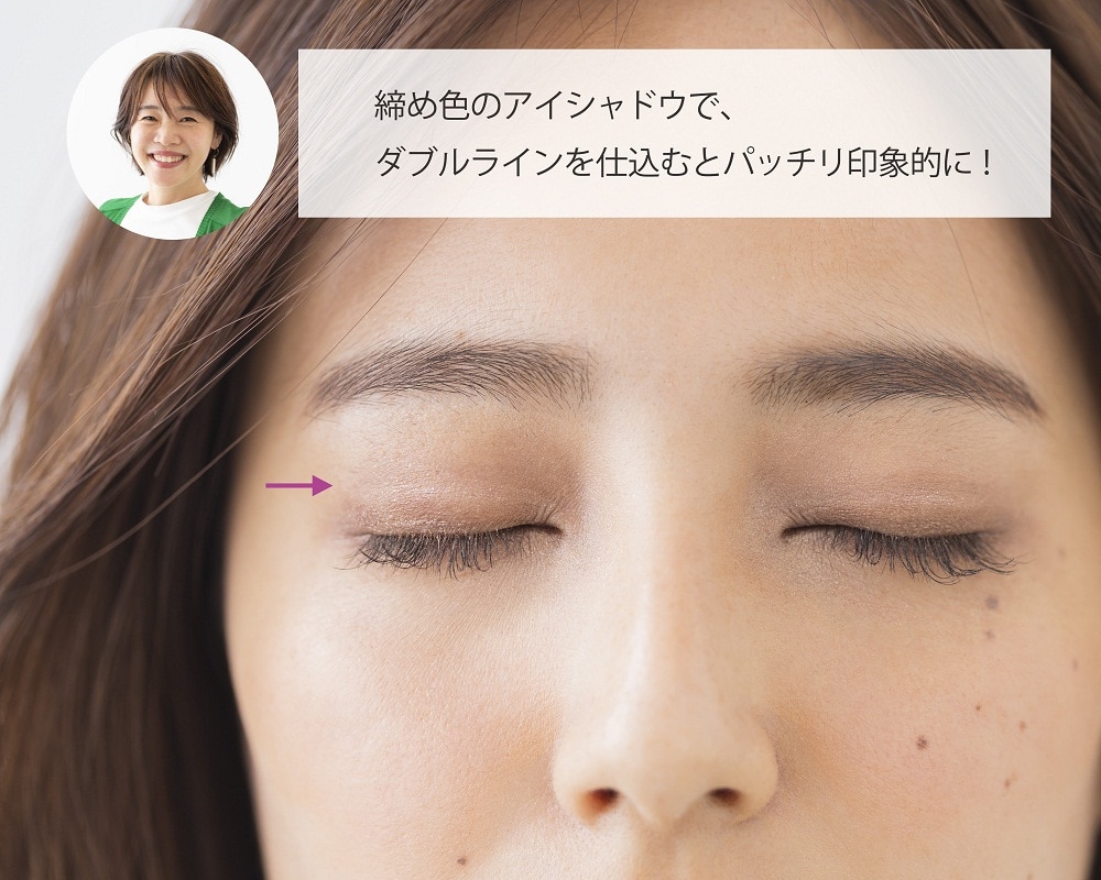 締め色のアイシャドウでダブルラインを仕込み