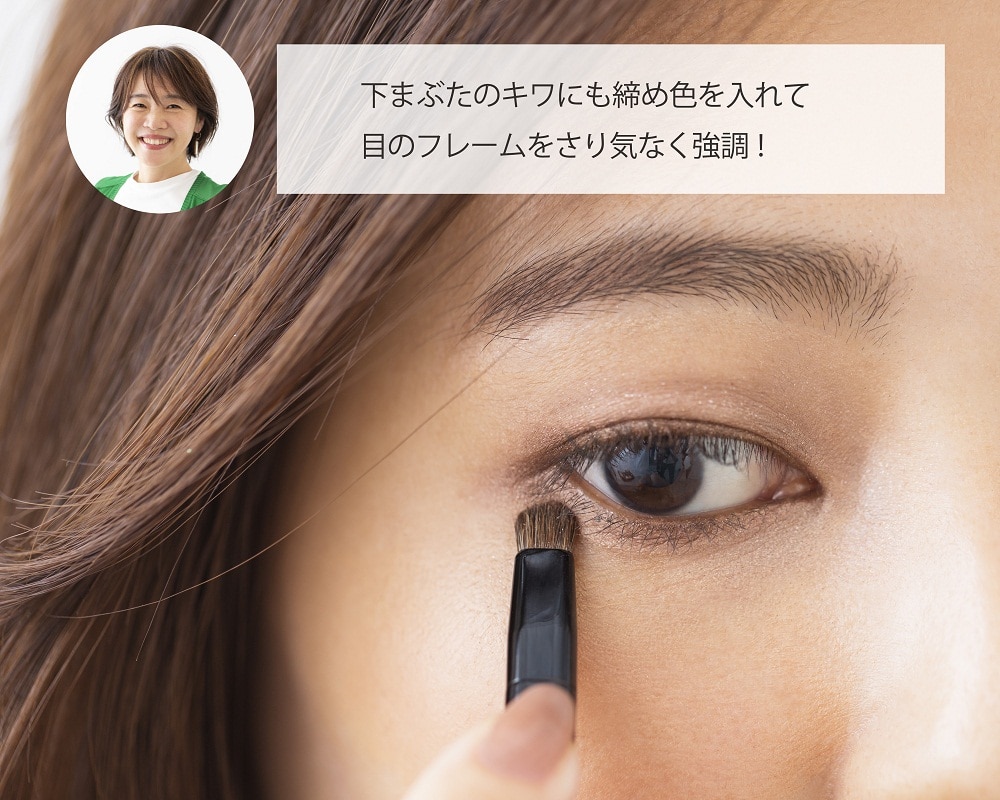 下まぶたのキワにも締め色アイシャドウを入れて、フレームをさりげなく強調して。ぼんやり目もとも引き締まって見えます。
