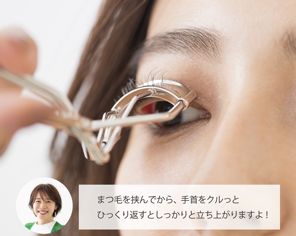 一重さん&奥二重さんはビューラーの使い方もひと工夫。まつ毛をはさんだら、手首をひっくり返すようにビューラーをクイッと上へ持ち上げて。こうすることでまぶたの重みに負けないカールがしっかりつけられます。