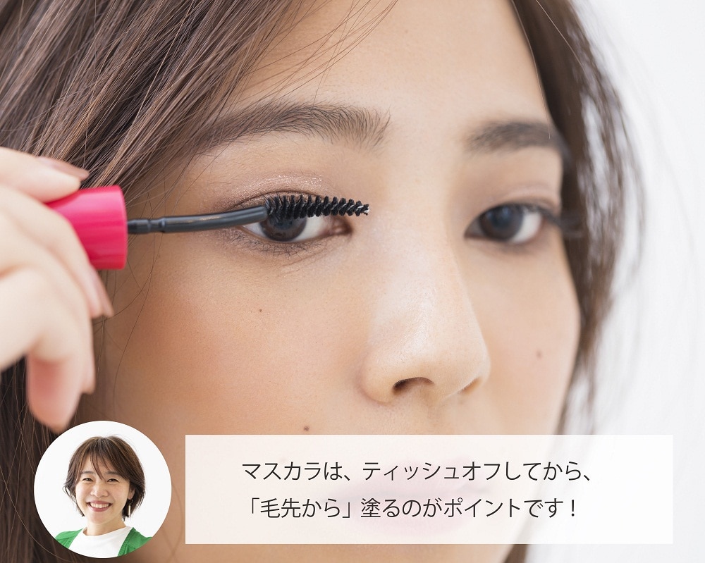 ポイントは、「毛先から」塗り始めること。ティッシュオフして余分なマスカラを拭ったら、毛先を1本1本セパレートさせるように丁寧に扇状に塗っていき、まつ毛を放射状にキープ。目の形が丸く見えるので、ぱっちりとした印象に仕上がります。カラーもブラックよりブラウンを選ぶと、よりナチュラルでやさしい雰囲気に。