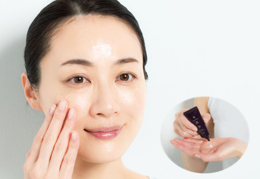 上まぶたは手の甲に一旦つけてから、点置きして指先でなじませる。下まぶたは4ヵ所に点置きしたら、逆三角形をイメージしてトントンと指の腹でなじませる。