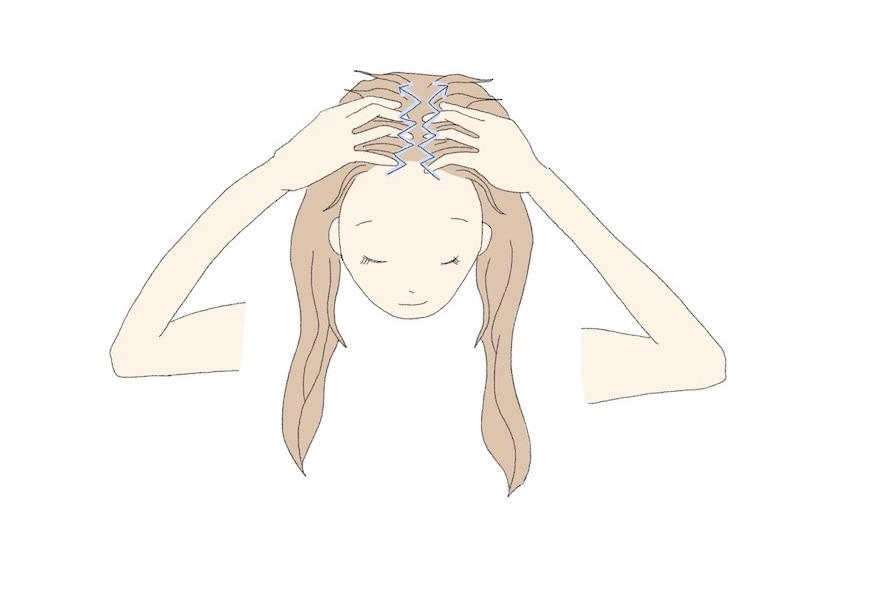 生え際から頭頂部に向かって、指の腹で細かくジグザグと動かすようにマッサージを。紫外線などのダメージを受けやすく、皮脂分泌が盛んな頭頂部は、案外洗えていなく薄毛の要因になっているケースもあるので、漏らさず丁寧に洗いましょう。