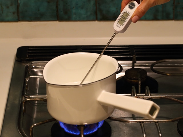 1.鍋に水を入れて火にかけ、65℃ぐらいまで上げる。