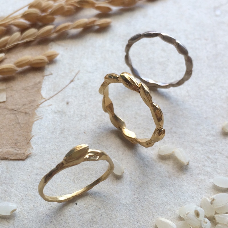 18金コーティングのほうは、モミの力強いスジが表現され、指先に存在感を。シルバーのリングは、米粒の繊細な柔らかな線が生きたデザイン。