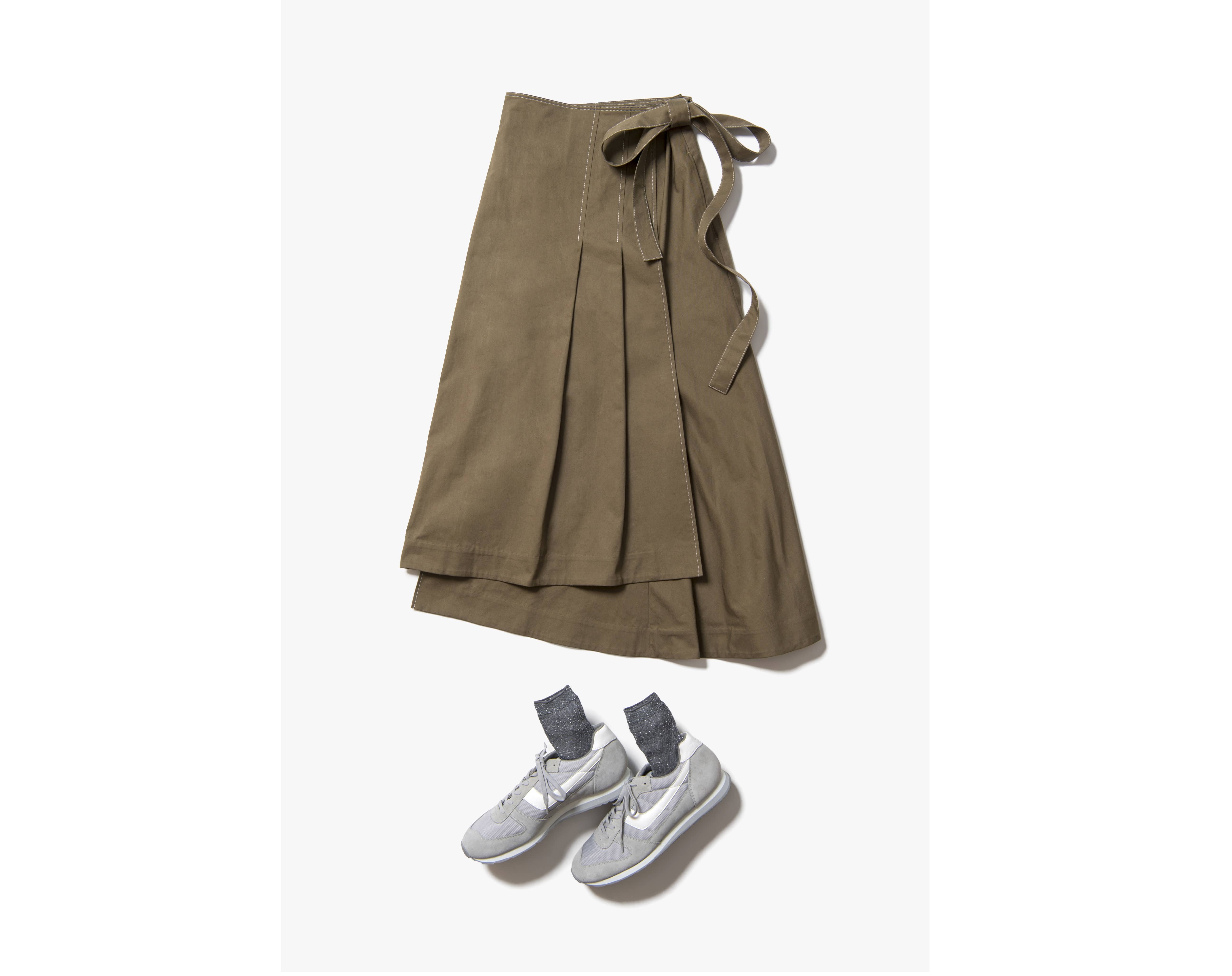 スカート 34,000円(税抜)/マイリ、ソックス 1,100円(税抜)/タビオ(タビオ株式会社)、スニーカー 21,800円(税抜)/リプロダクション オブ ファウンド(アイ ファウンド)