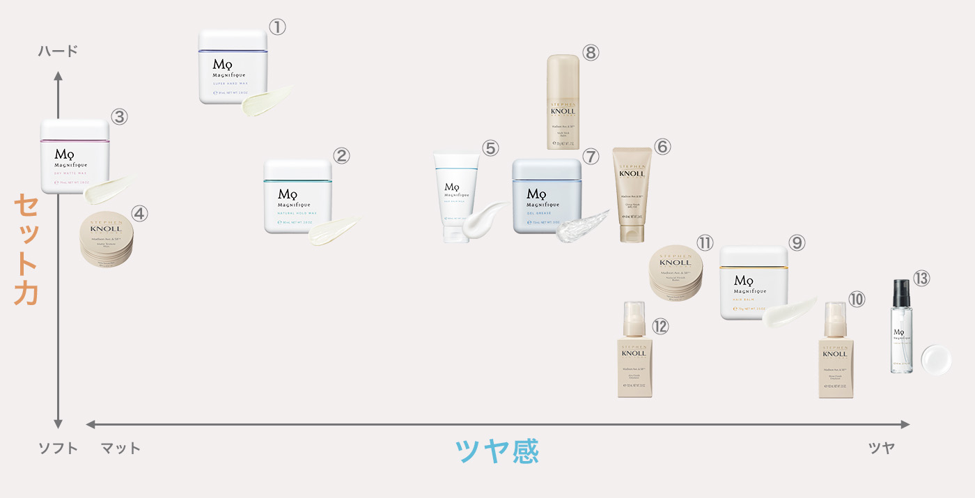 図内の上に行くにつれてセット力が強く、右方向に行くとツヤが強くなるという見方に