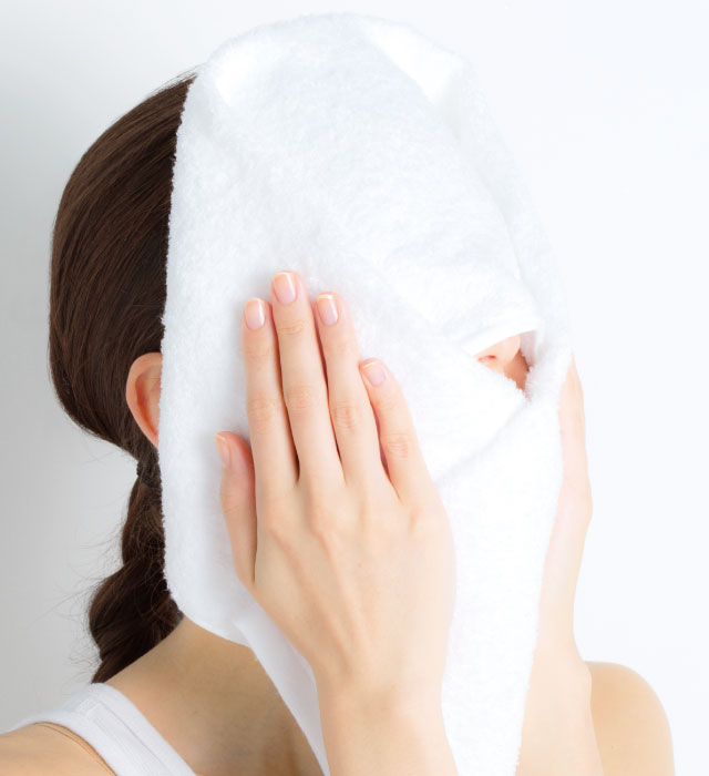 ①洗顔後、ホットタオルで肌をあたためる。(熱さの感じ方には個人差がありますので、やけどにご注意ください。)