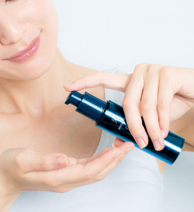 ②肌潤改善エッセンスを4プッシュ手にとり、肌全体になじませる。