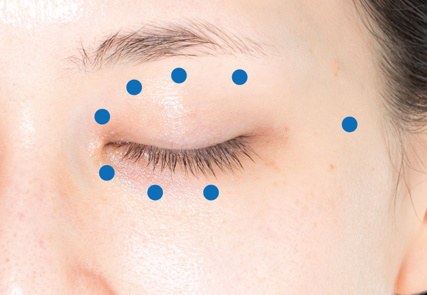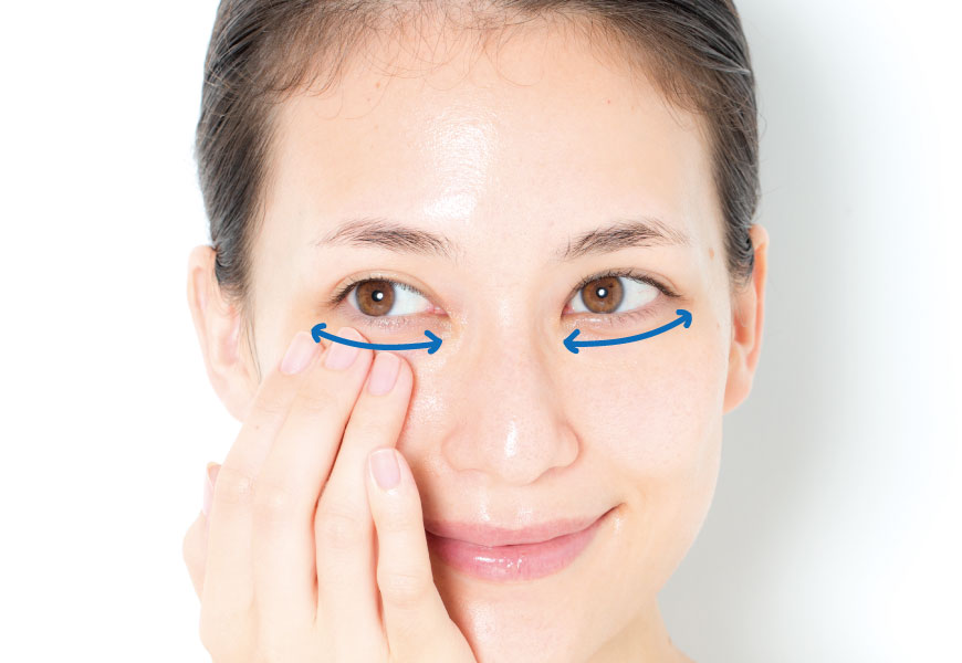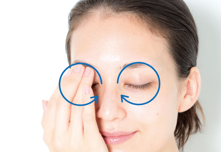 ①中指を中心に、指の腹で上まぶたから下まぶたに向かって優しく円を描きます。(左右各3回)