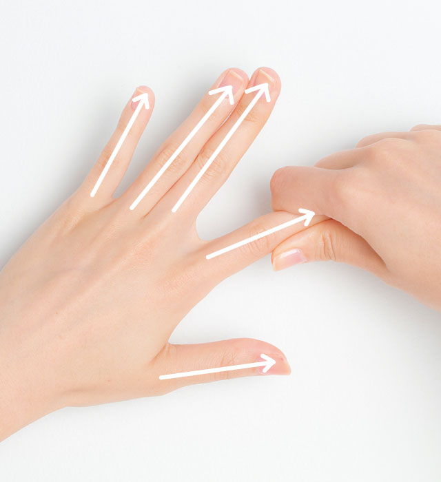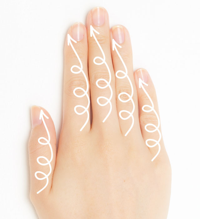 指を1本ずつ、らせんを描くようにくるくるとマッサージ。特に第二関節まわりを丁寧に。
