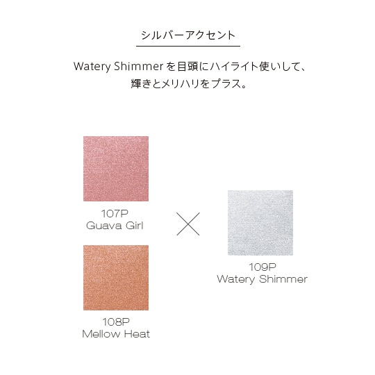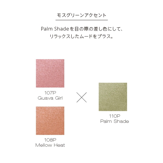 Guava Girl もしくはMellow Heat をアイホールに広げてから、アクセントにWatery Shimmer もしくはPalm Shade をオン。