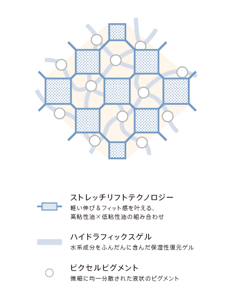 ストレッチリフトテクノロジー*1とは、肌に柔軟に密着して化粧持ちとハリを叶える網目状の被膜テクノロジー。