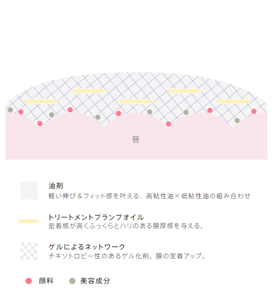 1.軽やかな伸び広がりとフィット感 低粘度と高粘度の油剤をバランスよく配合し、ムラなく均一に伸び広がります。さらに、力を加えると液状に、止まるとゲルになるチキソトロピー性のあるゲル化剤を配合。軽い伸び広がりがありながら、唇の上にしっかりととどまり、厚みと弾力が感じられるツヤ感が形成されます。 2.縦ジワレスなハリ感*1と美しいツヤ感