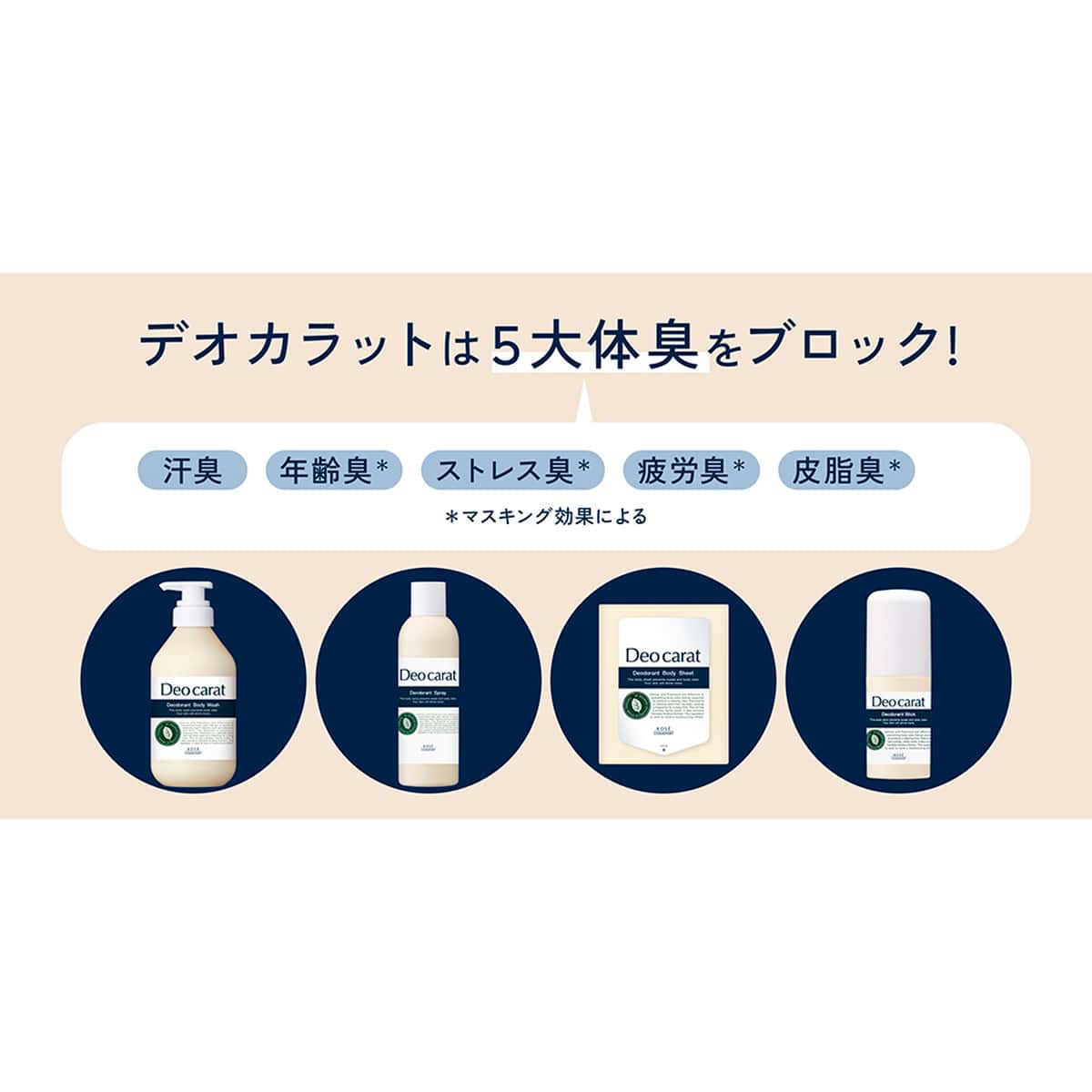 ●嗅覚レセプターに先回り。悪臭をブロック。現代の5大体臭【汗臭・大人臭・ストレス臭・疲労臭・皮脂臭】汗だけでなく、あらゆるニオイをケア。