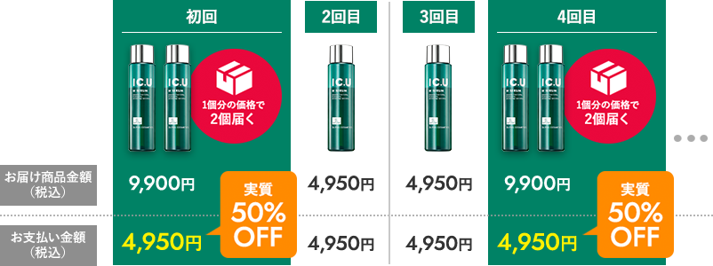 ※ 50%OFFとは1個分の価格で2個お届けするということです。 ※定期お届け便は最低3回のお届けが基本条件となります。3回お届けした場合のお支払い総額は14,850円(税込)です。 ※ポイントはメゾンコーセーオンラインショップにて1pt=1円でお使いいただけます。ただし、定期継続回のお支払いにはご利用いただけません。 ※お届け周期の変更、次回お届けのスキップなどはお電話・マイページで簡単にできます。