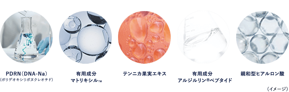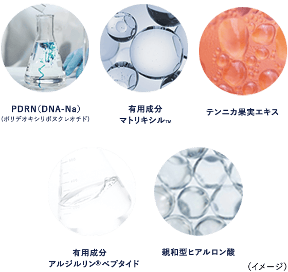 水・BG・グリセリン・エタノール・DPG・水添ポリイソブテン・ジグリセリン・水添レシチン・ステアリン酸水添ヒマシ油・セテアリルアルコール・DNA-Na・アセチルヒアルロン酸Na・アセチルヘキサペプチド-8・グリコシルトレハロース・テンニンカ果実エキス・トコフェロール・パルミトイルペンタペプチド-4・EDTA-2Na・(アクリル酸Na/アクリロイルジメチルタウリンNa)コポリマー・(アクリレーツ/アクリル酸アルキル(C10-30))クロスポリマー・イソステアリン酸・イソヘキサデカン・オクチルドデカノール・オレイン酸ソルビタン・カルボマー・コレステロール・ジメチコン・テトラ(ジ-t-ブチルヒドロキシヒドロケイヒ酸)ペンタエリスリチル・トリエチルヘキサノイン・トリセテアレス-4リン酸・ヘキサ(ヒドロキシステアリン酸/ステアリン酸/ロジン酸)ジペンタエリスリチル・ポリソルベート20・ポリソルベート80・ポリプロピレン・ミネラルオイル・加水分解水添デンプン・水酸化Na・乳酸Na・ソルビン酸K・フェノキシエタノール