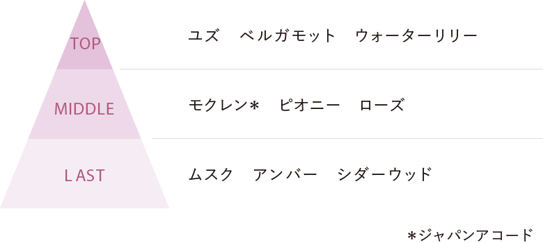 ユズのアクセントで一層華やかなトップから香りが移ろい、ラストノートではムスクやシダーウッドが全体をまとめ上げ、落ち着きのある上質な香りへと昇華してゆきます。