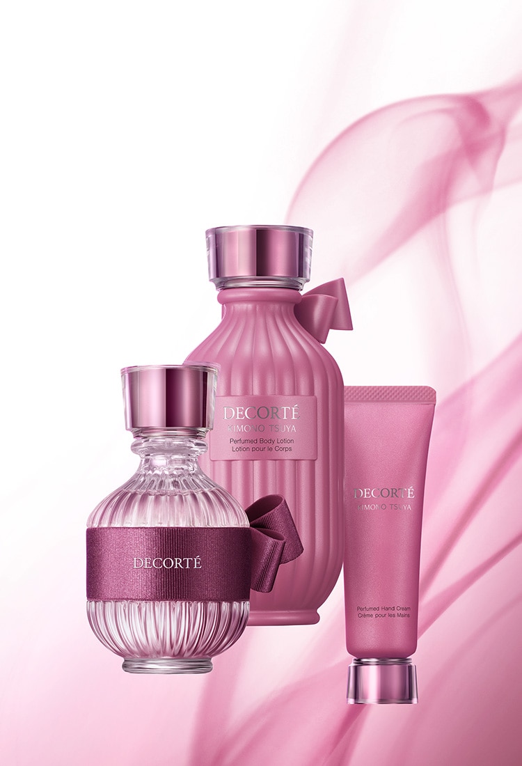 夜はキモノ リン パフュームド ボディローションの香りに包まれて、朝にキモノ ユイ オードトワレを纏えば、きらめくような可憐さの奥に大人の魅力を合わせ持つことができます。
