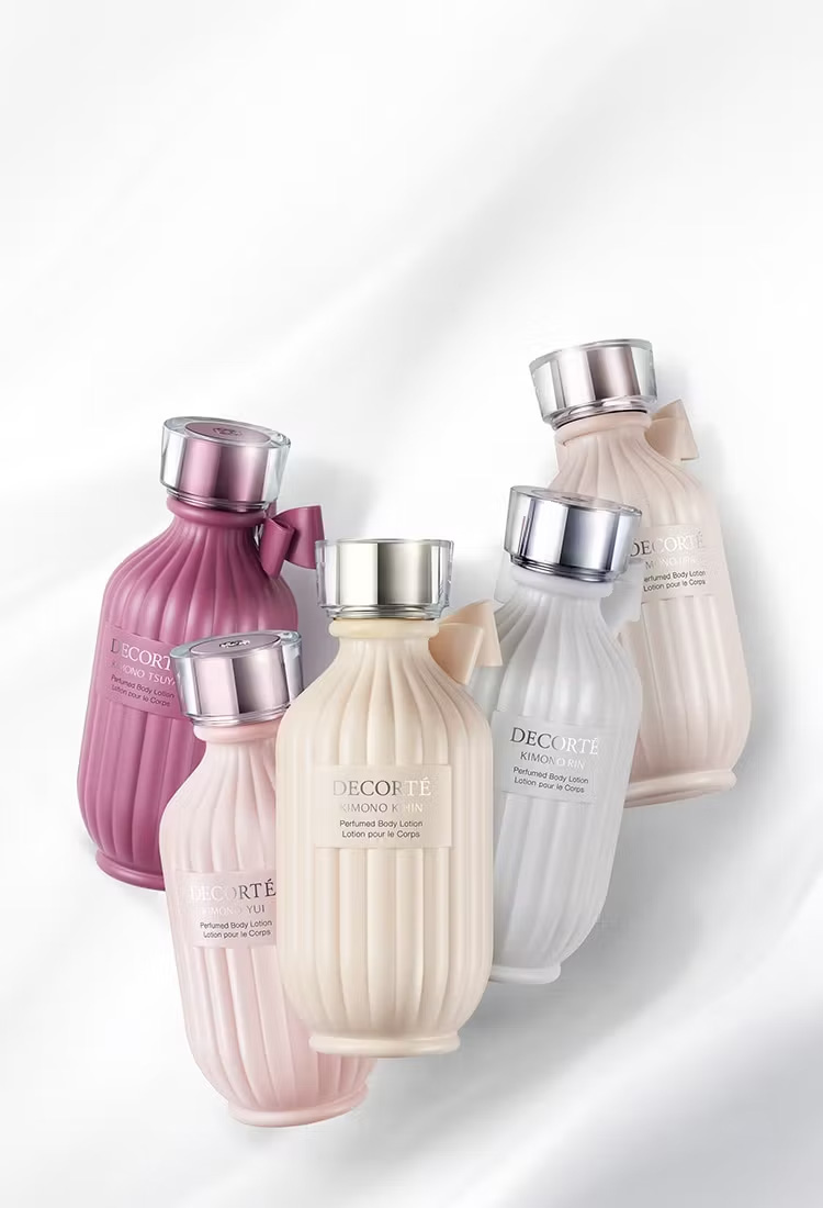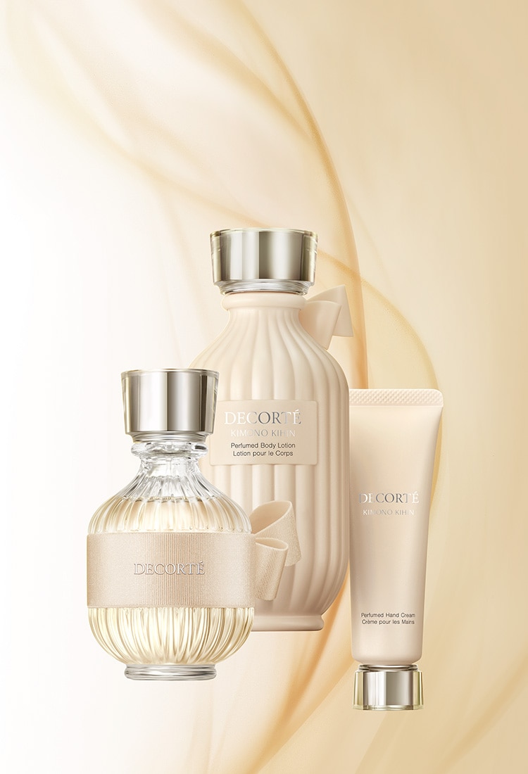 夜はキモノ リン パフュームド ボディローションの香りに包まれて、朝にキモノ ユイ オードトワレを纏えば、きらめくような可憐さの奥に大人の魅力を合わせ持つことができます。
