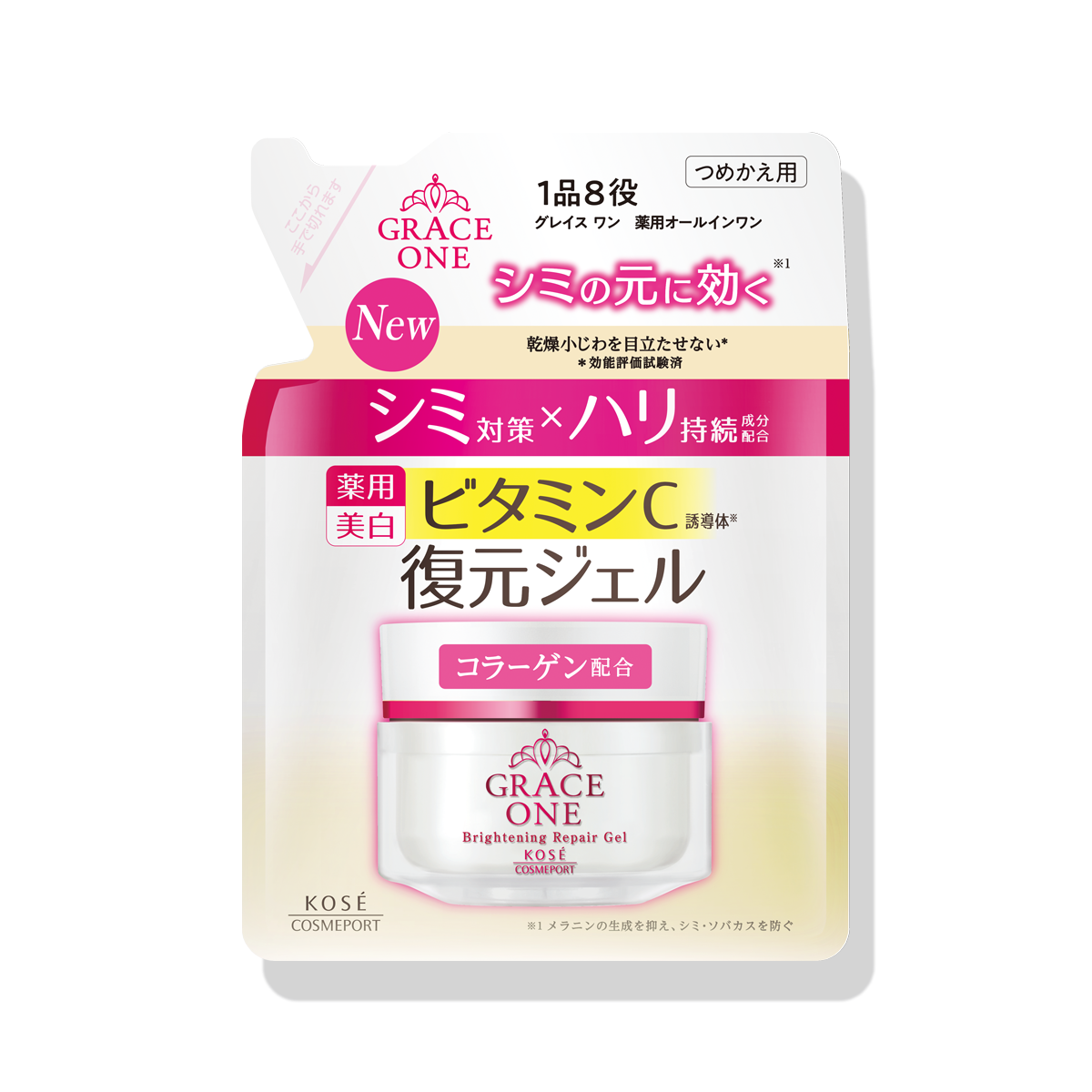 美白有効成分 ビタミンC誘導体配合。ピンっとしたハリを与え、乾燥小じわ目立たせない(効能評価試験済み)、ピンっとした白玉肌へ。1品8役のオールインワンジェル。あっという間にピーンと復元*するジェルタイプ。◇お得なつめかえ用。
