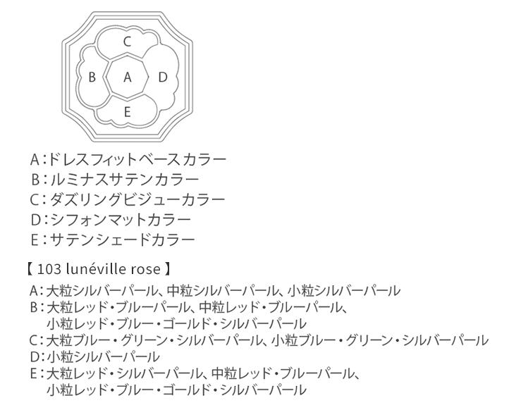●異なる質感をレイヤードすることで、立体感と華やぎをプラスします。Aは、密着感を高めながらトーンアップと透明感のある仕上がりを叶えるドレスフィットベースカラー。Bは、サテン生地のように上質なツヤをあたえるルミナスサテンカラー。Cは、ジュエリーを纏うように輝きをプラスするダズリングビジューカラー。Dは、ソフトマットな質感で陰影をつけるシフォンマットカラー。Eは、やわらかな締め色で深みのある目もとを演出するサテンシェードカラーです。