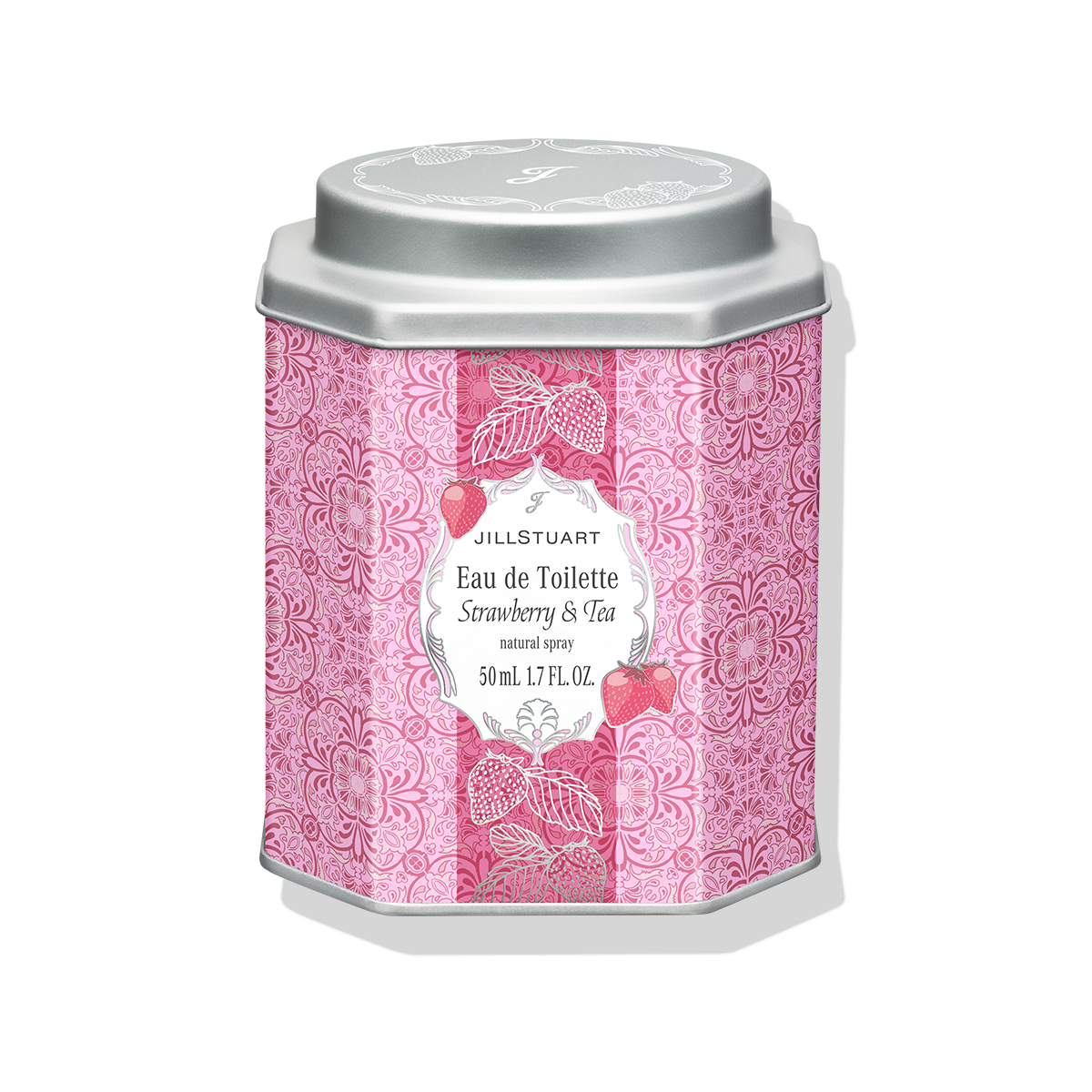 ●ヴィンテージのテーブルウェアを思わせる、いちご色のオリジナルデザイン。輝くいちごのジュレのようなクリアカラーのキャップや、アカンサス模様をあしらったラベルが高級感を出すとともに、フレッシュないちごのイラストで可愛らしさも演出しています。紅茶缶をイメージしたパッケージは、オードトワレを取り出した後も手もとに残して、JILL STUARTの世界観を楽しみ続けられるデザインです。