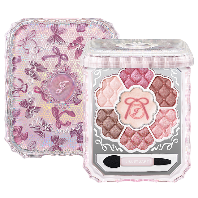 ●ブルームクチュール アイズ リボンファッションショーは、ピンクトーンの様々なリボンをモチーフとした7色のパレット。リボンパターンにチュールを思わせるオーロラカラーを合わせ、ランウェイに登場する華やかなドレスを表現したコンパクトです。アイカラーの表面には、ドレスの質感をイメージしたプレスを刻み、A色には「J」とリボンの限定ステンシルを施しました。