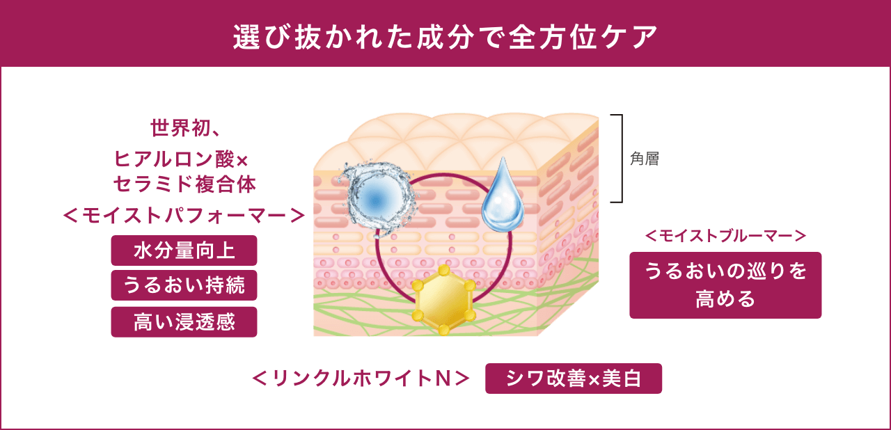 瞬時に浸透し、肌の水分量を向上させ、長時間うるおいを持続。