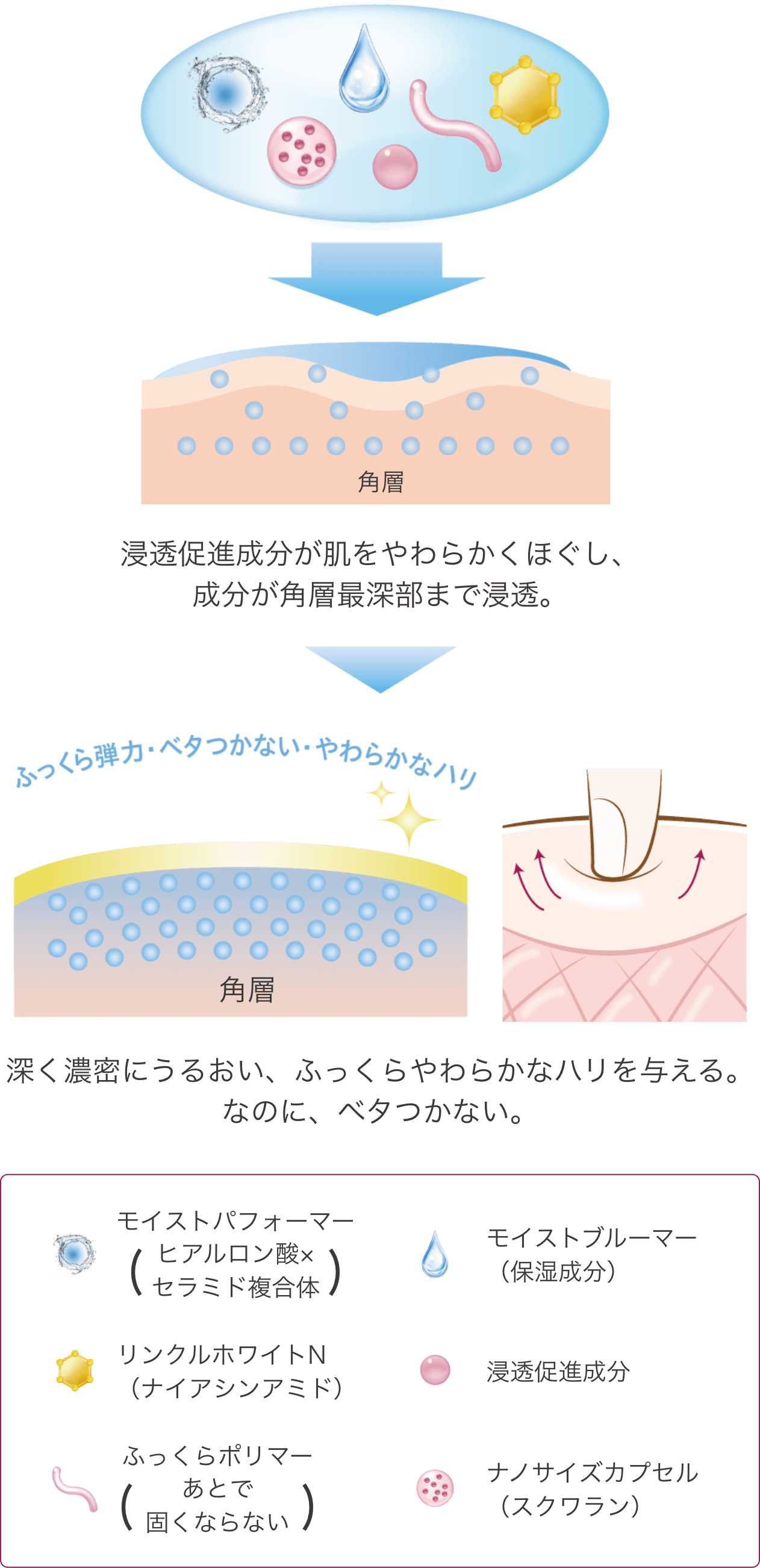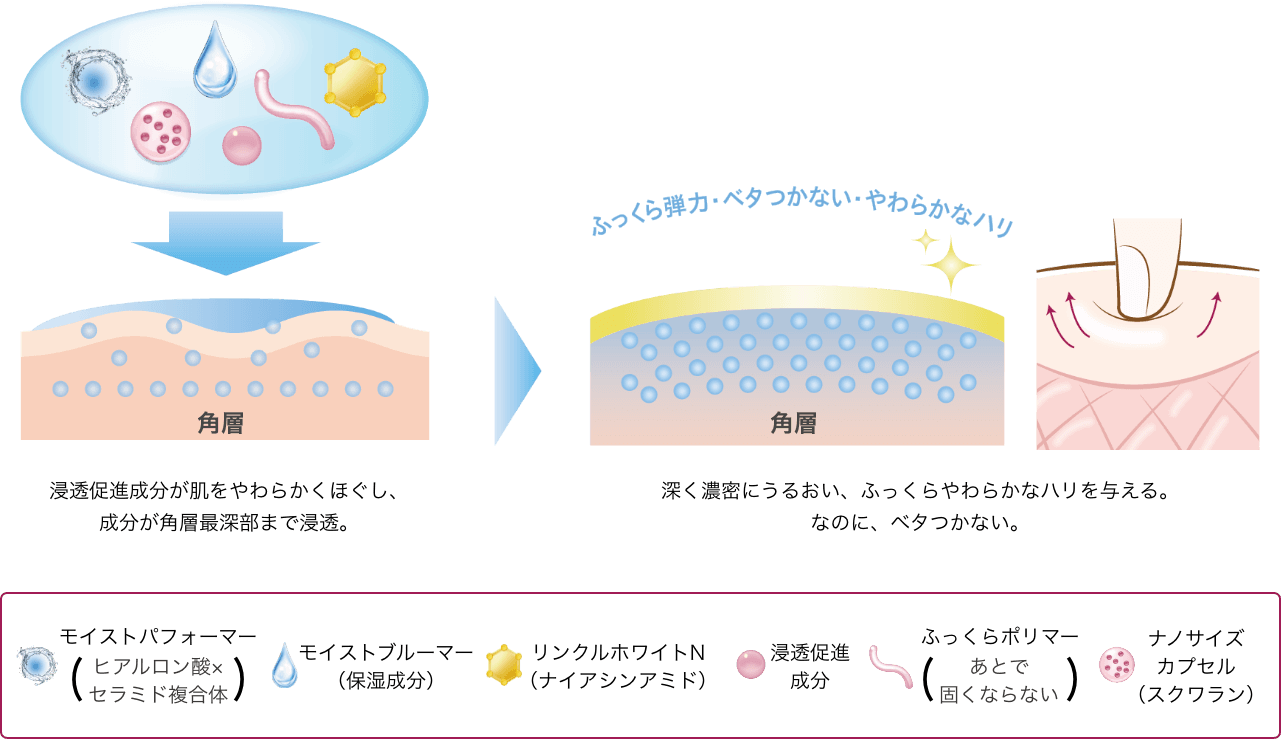 速攻しっとり、濃密にうるおってベタつかない、ふっくらやわらかなハリ肌を叶えます。