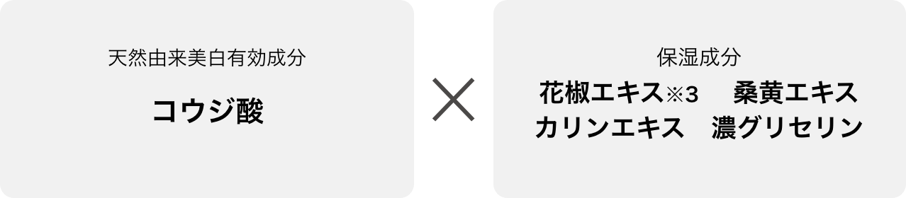 精製水、ジプロピレングリコール、1,3-ブチレングリコール、エタノール、濃グリセリン、トリイソステアリン酸トリメチロールプロパン、N-アセチル-L-ヒドロキシプロリン、d-δ-トコフェロール、アセチル化ヒアルロン酸ナトリウム、カリンエキス、グリコシルトレハロース・水添デンプン分解物混合溶液、サンショウエキス、トランス-レスベラトロール、フィトグリコーゲン、ボタンエキス、メマツヨイグサ抽出液、ユリエキス、桑黄抽出液、天然ビタミンE、N-ステアロイル-L-グルタミン酸二ナトリウム、エデト酸二ナトリウム、オレイン酸エチル、キサンタンガム、クエン酸、クエン酸ナトリウム、ジェランガム、セトステアリルアルコール、ヒドロキシメトキシベンゾフェノンスルホン酸ナトリウム、ポリアクリル酸アミド、ポリオキシエチレンステアリルエーテルリン酸、ポリオキシエチレンセチルエーテルリン酸、ポリオキシエチレンラウリルエーテル(7E.O.)、ポリオキシエチレン硬化ヒマシ油、モノオレイン酸ポリオキシエチレンソルビタン(20E.O.)、軽質流動イソパラフィン、親油型モノステアリン酸グリセリル、水酸化アルミニウム、無水エタノール、エチルパラベン、メチルパラベン、香料、カラメル、酸化チタン