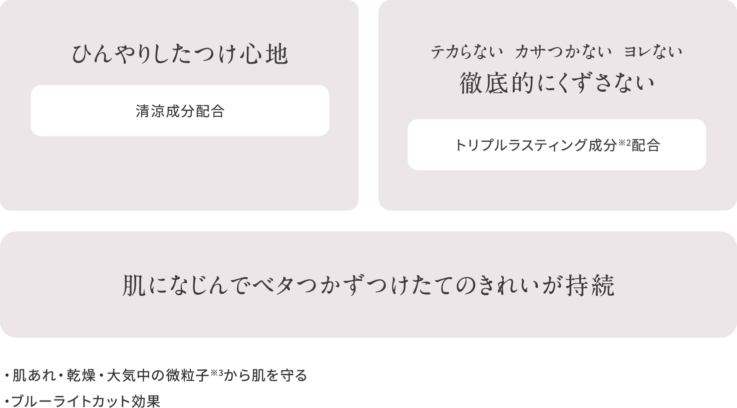 ※皮脂くずれ・乾燥感・ヨレ・毛穴落ち・粉浮き・くすみ (当社調べ。効果には個人差があります。)