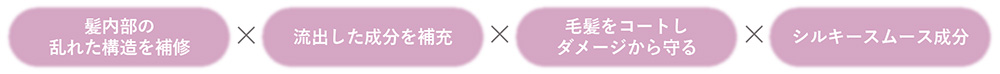 ※シルキースムース成分はポリクオタニウム-51、浸透型ナノケラチンカプセルはジココイルエチルヒドロキシエチルモニウムメトサルフェート・コレステロール・セラミドNG・セラミドNP・加水分解ケラチン羊毛、キューティクル補修コート成分はシロキクラゲ多糖体、キューティクルケア成分はフェニルトリメチコンです。