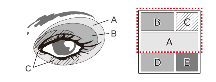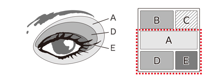 E:目のきわ・下まぶたの目じり側にライン状にぼかします。