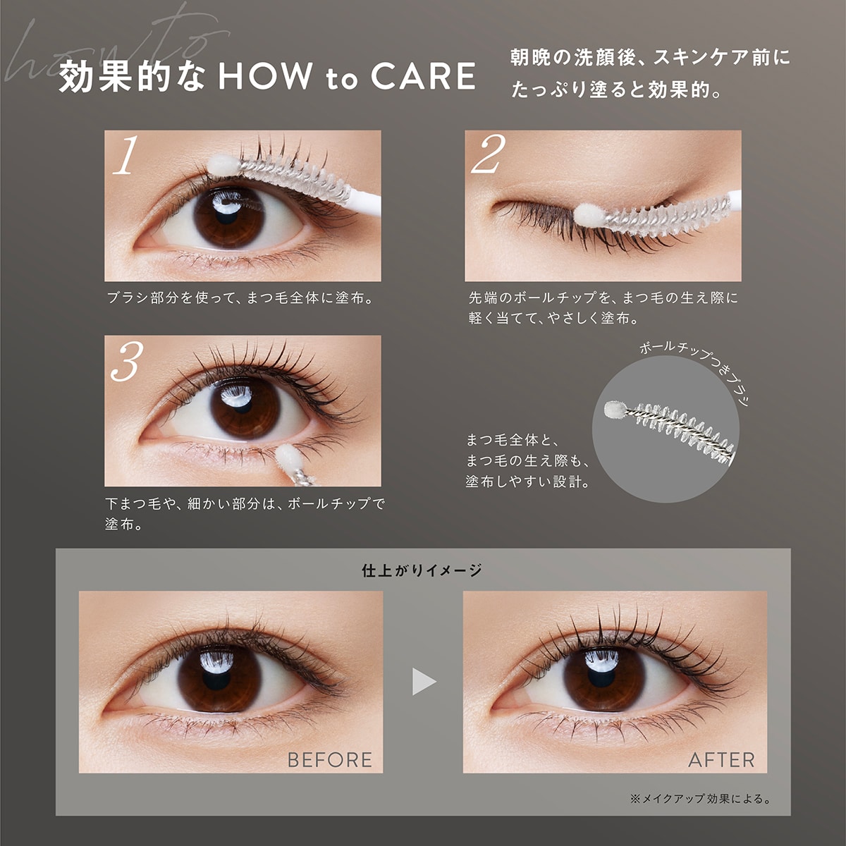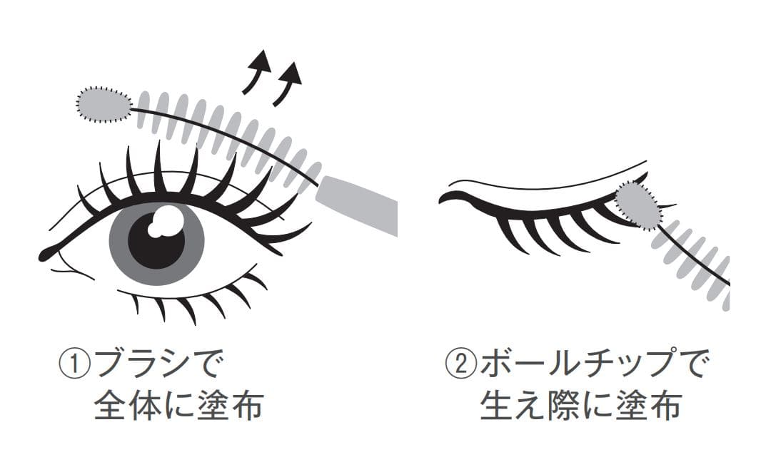 ●先端に肌あたりのよいボールチップがついたカーブブラシを採用。上まつ毛にはブラシ、下まつ毛や生え際などの細かい部分にはボールチップで塗布することで、簡単にまつ毛全体に均ーに塗布できます。